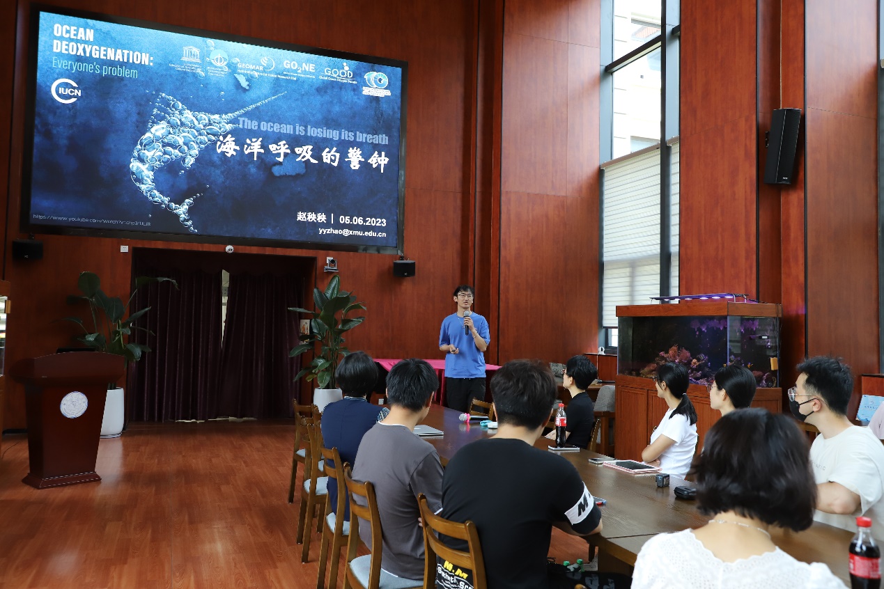 Dr. Yangyang Zhao giving an outreach lecture on ocean deoxygenation to university students and researchers at Xiamen University (photo credit: MEL).