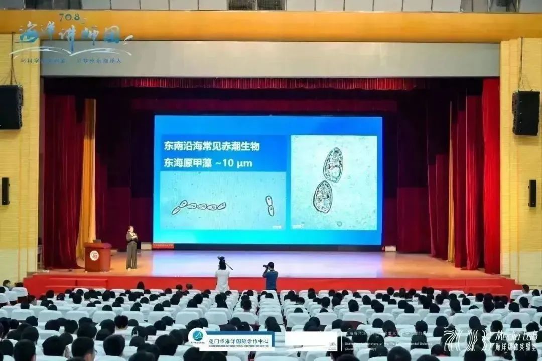 Dr. Xin Lin giving an outreach lecture on algal blooms to high-school students at Shiguang School in Quanzhou City (photo credit: MEL)