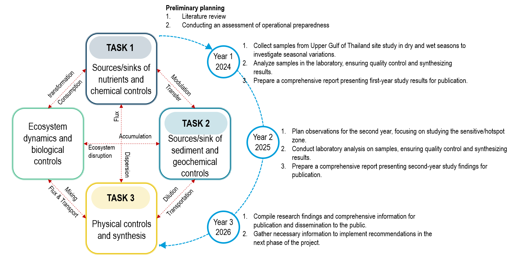 Thailand has been taking proactive measures to address the severe eutrophication and hypoxia issues plaguing the Upper Gulf of Thailand. As part of the COASTAL-SOS initiative, Thailand is embarking on comprehensive scientific study to examine the Upper Gulf of Thailand’s environmental trajectory over the past 50 years and forecast its future directions for the next 20 years (Fig. 1).