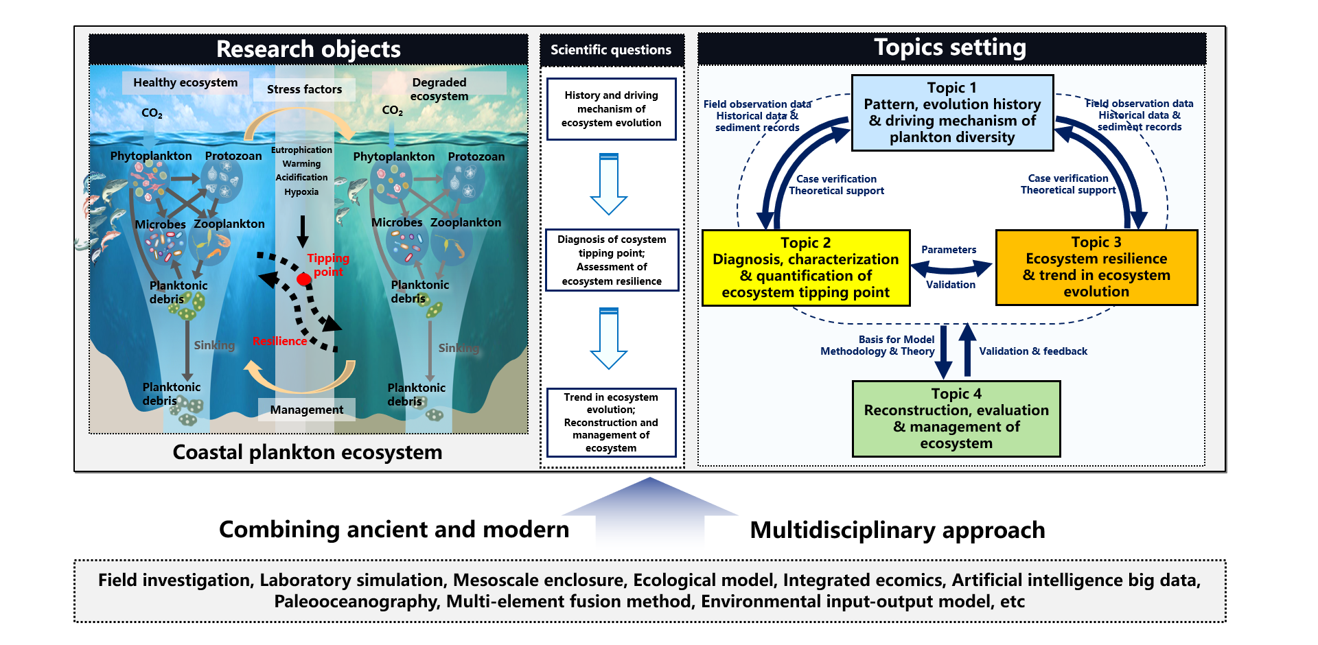 Planktonic ecosystems, composed of zooplankton, phytoplankton, microbe, and their living environments, are the cornerstone of marine ecosystem and regulators of marine carbon sequestration and storage, regulating the global environment and climate. Human activities and global changes have profoundly affected the planktonic ecosystem, including ocean acidification, warming, deoxygenation, and eutrophication, causing a decline in species diversity, weakened carbon sequestration and storage capacity, and a decline in service functions. This has led to a series of irreversible ecological and environmental effects, approaching tipping points and even causing transformation and reorganization of marine ecosystems, becoming one of the most prominent environmental problems in the world today.